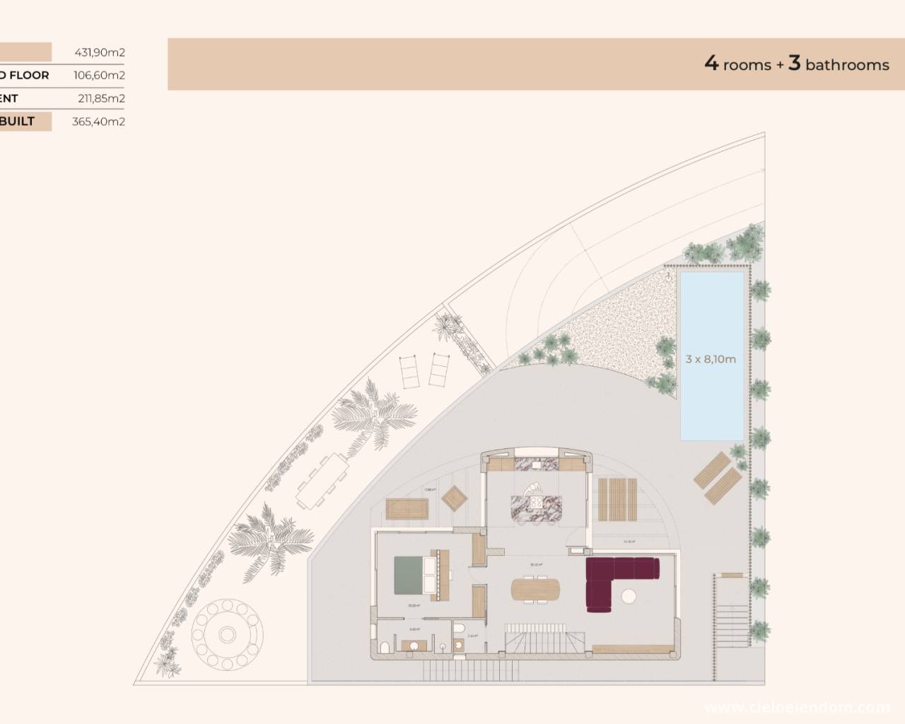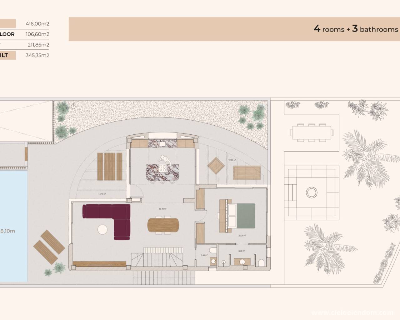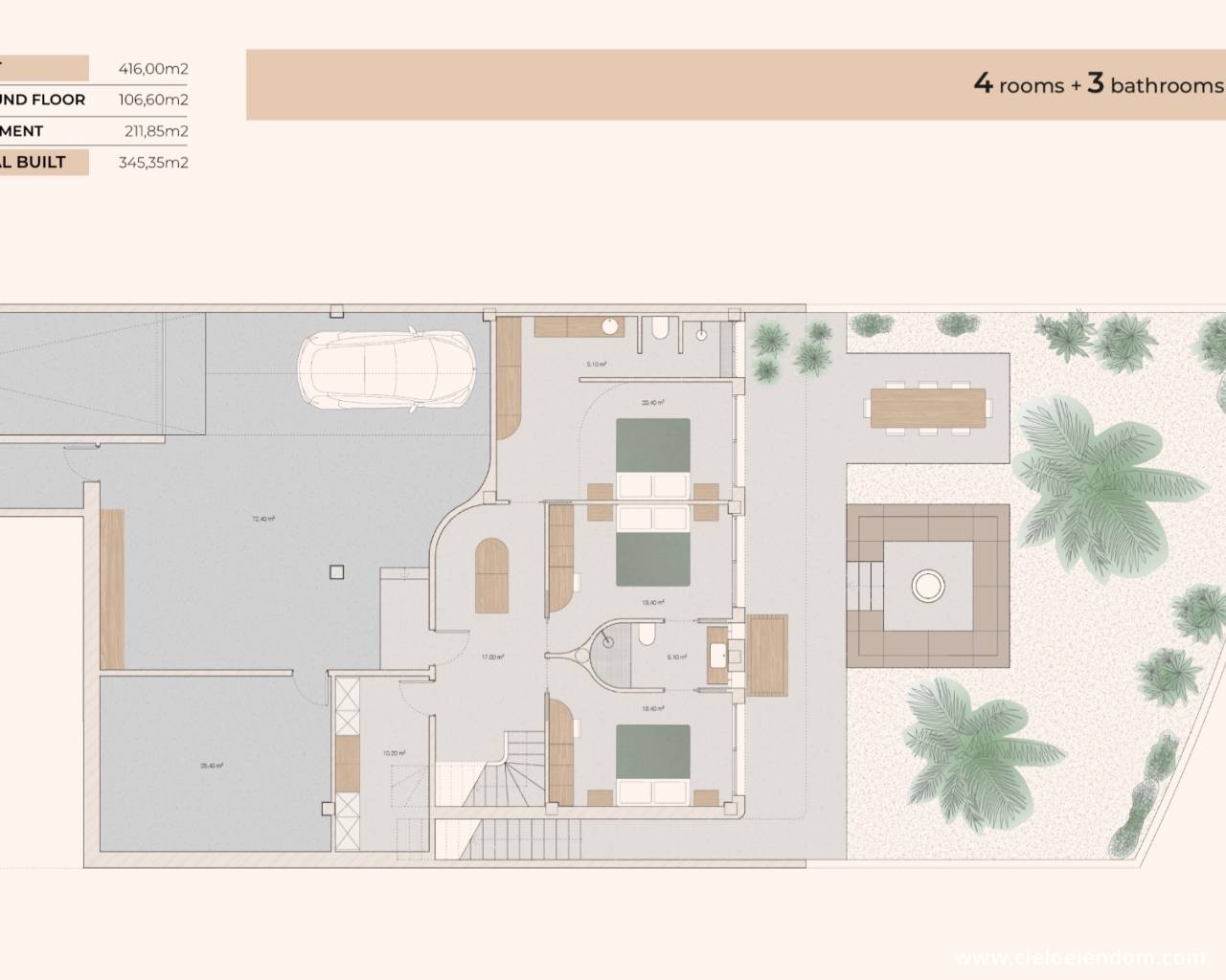 These exclusive villas are spacious detached homes set in beautiful surroundings, with plot sizes ranging from approximately 349 to 431 m². The properties offer a total built area of approximately 326.3 to 365.4 m² and feature 4 bedrooms, 3 bathrooms, and 1 guest toilet.